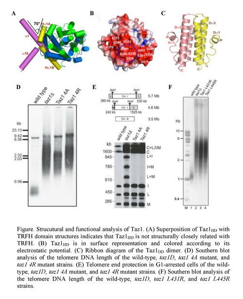 端粒是真核生物染色體(ti) 最末端的區域,雖然不具備編碼蛋白質的功能,但是端粒對染色體(ti) 的保護功能在基因完整性和細胞生理學其他方麵的調節都起著至關(guan) 重要的作用。端粒長度的異常與(yu) 癌症及早衰等疾病之間存在密切關(guan) 聯。在哺乳動物細胞中,TRF1和TRF2是最早發現的端粒結合蛋白,包含有一個(ge) 中心的TRFH結構域和一個(ge) 碳末端的Myb結構域。TRF1和TRF2各自隻含有一個(ge) Myb結構域,通過TRFH結構域形成同源二聚體(ti) 發揮其結合端粒NDA的功能。裂殖酵母Taz1能夠結合端粒雙鏈DNA,在裂殖酵母端粒長度調節和保護中發揮重要的作用,被認為(wei) 是哺乳動物TRF蛋白的功能類似物。然而,Taz1在裂殖酵母中發揮上述作用的結構與(yu) 功能的分子機製並不清楚。